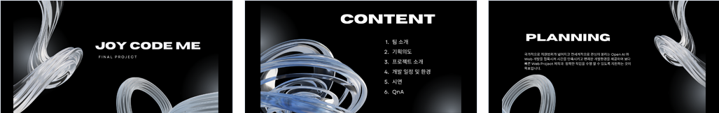 기획 의도 국가적으로 지원범위가 넓어지고 전세계적으로 관심이 쏠리는 Open AI 와 Web 개발을 접목시켜 시간을 단축시키고 편리한 개발환경을 제공하여 보다 빠른 Web Project 제작과 정확한 작업을 수행 할 수 있도록 지원