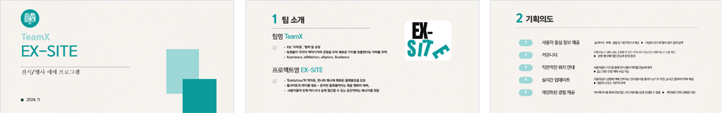 전시/행사에 특화된 예매 사이트입니다. 사용자 편의를 고려한 슬라이더, 목록, 정렬 등 직관적인 UI 제공을 통해 다양한 전시 및 행사 정보를 쉽게 탐색할 수 있습니다. 사용자들 간 경험을 공유할 수 있는 커뮤니티 기능으로 소통을 촉진하여 문화 행사에 대한 관심과 참여를 증대시킬 수 있을 것으로 기대합니다. 지도를 통한 직관적인 위치 안내를 통해 쉽고 편한 관람 계획 수립이 가능합니다. 사용자들의 경험에 의해 선호되는 전시/행사를 좋아요 순으로 추천, 실시간 업데이트하여 제공하여 대중의 선호도를 파악할 수 있습니다. 마이페이지를 통해 관심 있는 전시/행사의 편리한 조회 기능으로 개인화된 문화 경험을 지원합니다. |